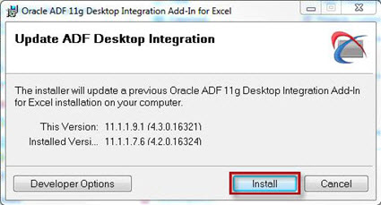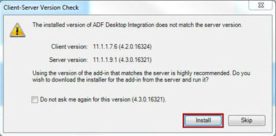 When you get the message, you must update the ADFdi add-in to the most current version to continue working successfully in Oracle. To download the installer for the add in from the server, click Install. To update ADFdi from outside of Oracle, see Install ADFdi. |